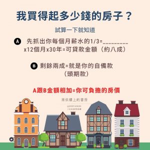 ⚠️建議把每個月房貸壓在收入的三分之一是目前市場上最多人建議的數字,畢竟不能因為買房失去生活品質,否則就變成名副其實的屋奴了!